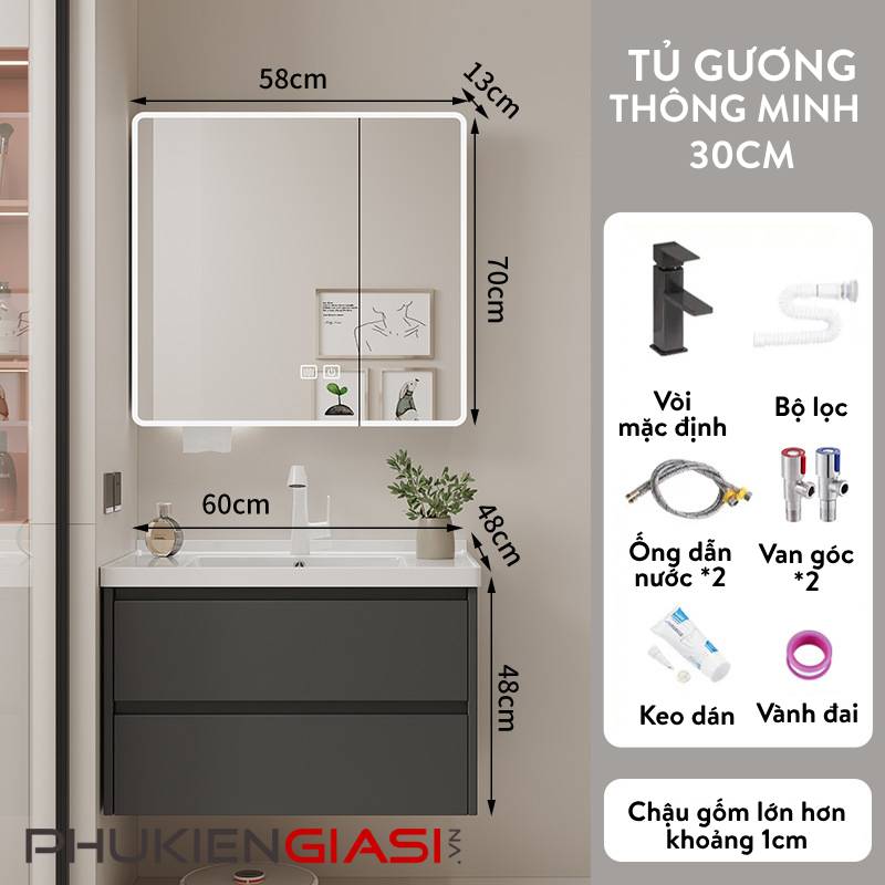 🔹 Kích thước phần tủ gương: 70 x 58 x 13cm