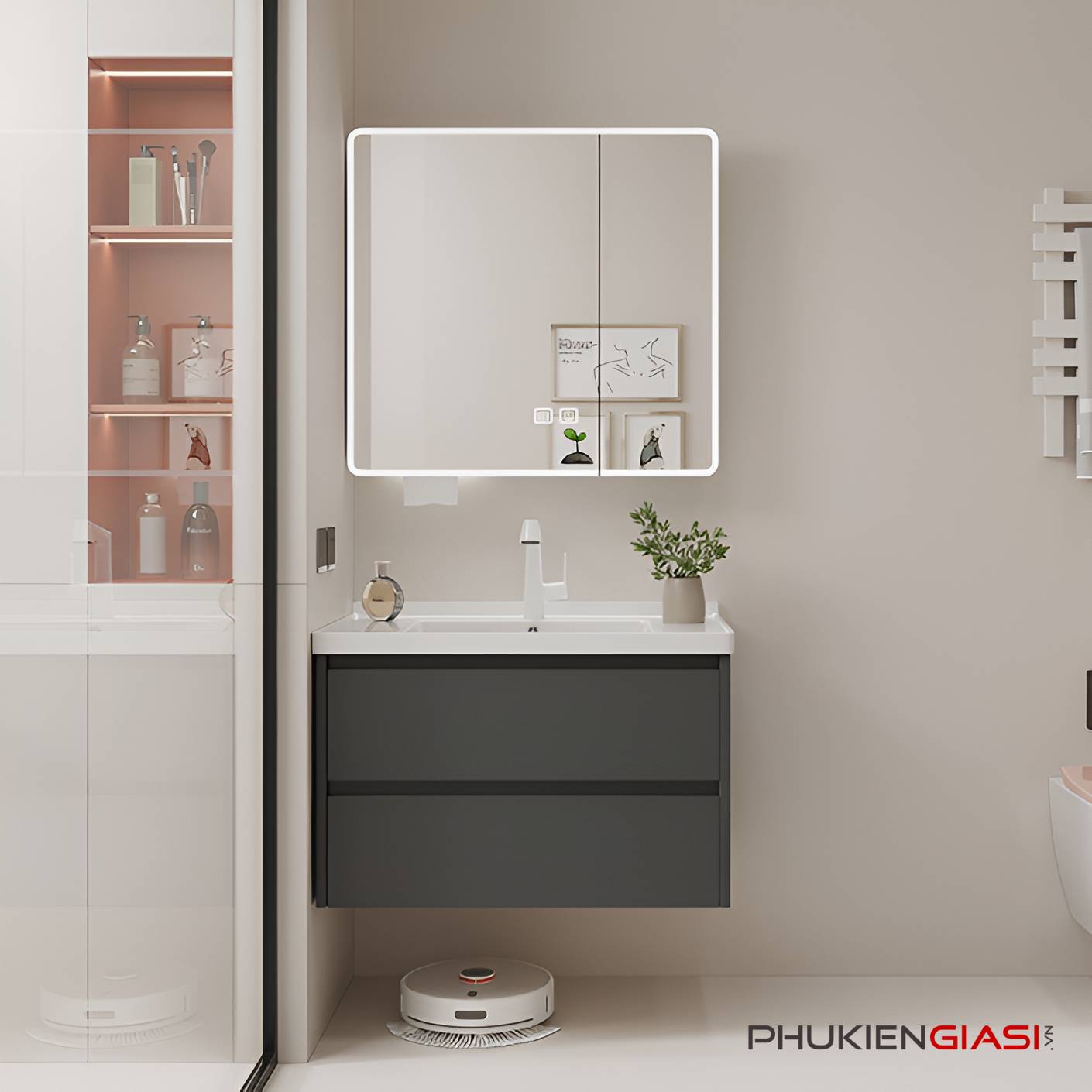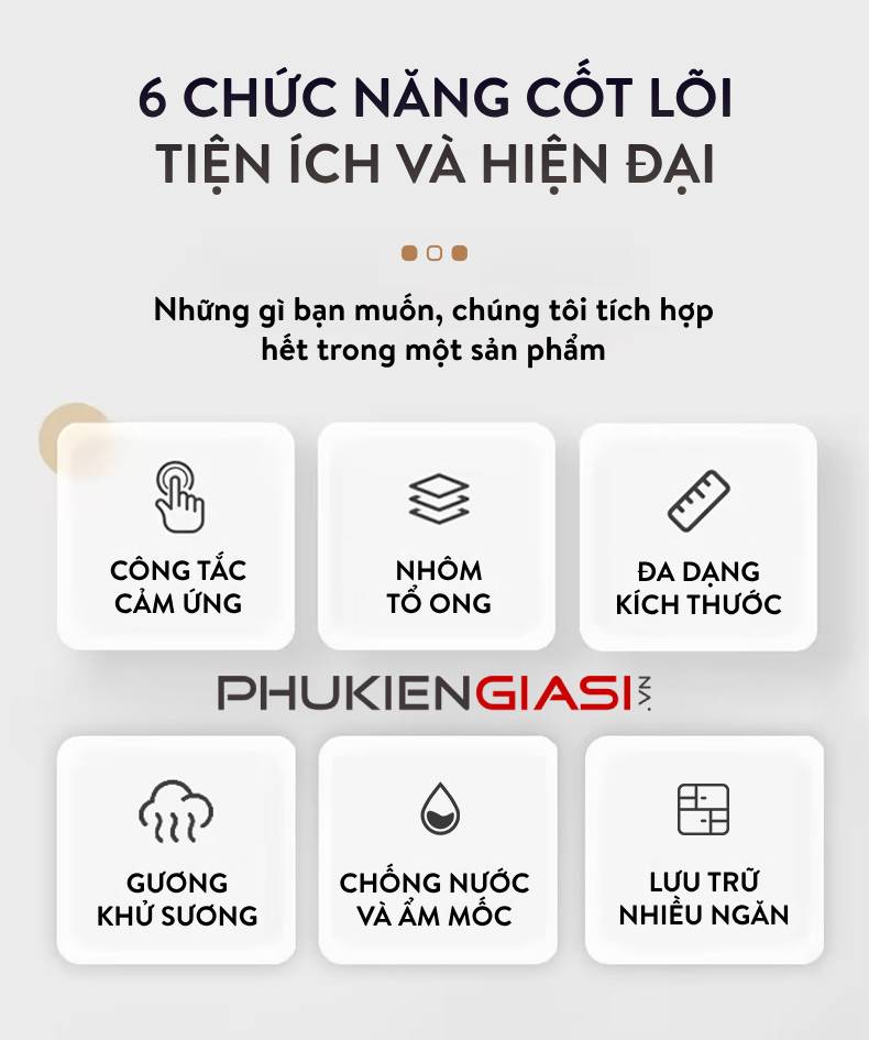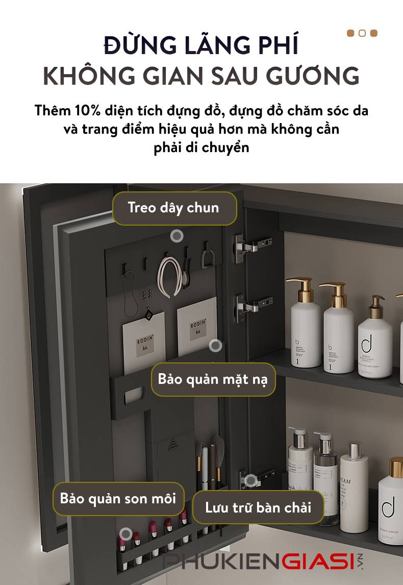 🔹 Tủ đựng đồ chính được thiết kế sau lớp gương. Gọn gàng, ngăn nắp, sạch sẽ với sức chứa lớn