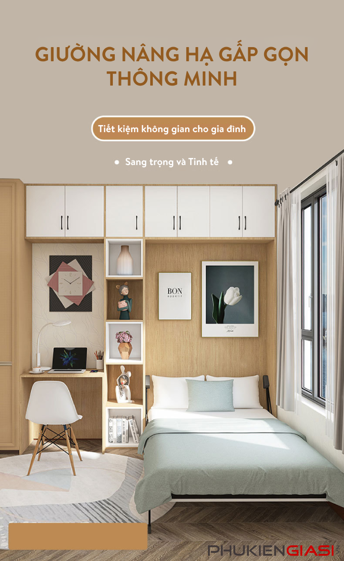 Khám phá giải pháp thông minh cho không gian với giường nâng hạ gấp gọn thông minh. Với thiết kế độc đáo, bộ giường giúp bạn tối ưu hóa diện tích phòng bằng cách lật phần chăn nệm áp sát tường khi không sử dụng, tạo ra một khoảng trống phía dưới cho việc sắp xếp kệ tủ hoặc sử dụng làm không gian sinh hoạt khác.
