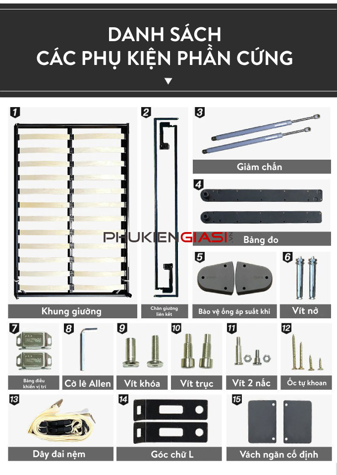 Bộ phụ kiện phần cứng chất lượng cao với ống neo linh hoạt, khung giường chắc chắn và các bộ phận đi kèm.
