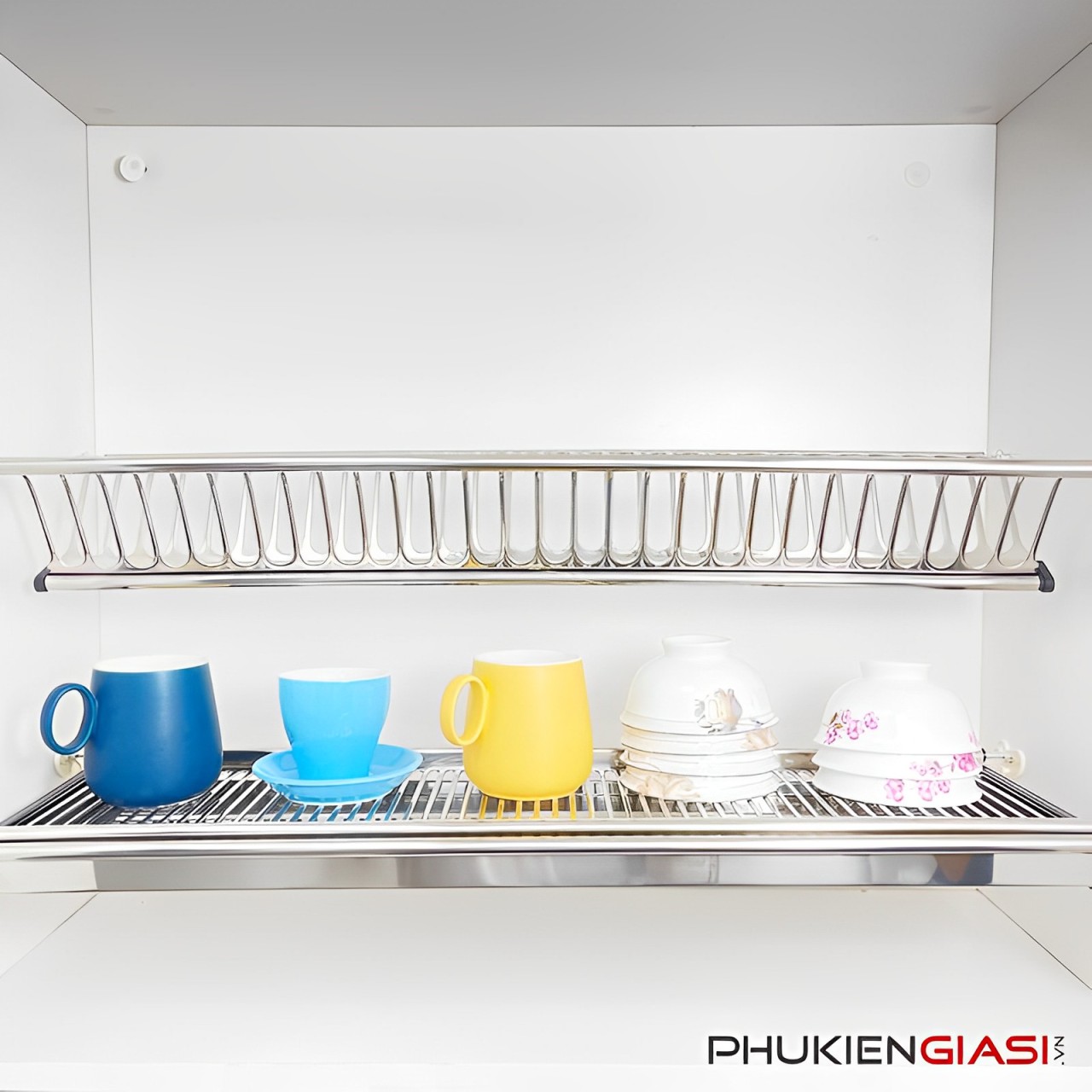 Thiết kế hai tầng giúp tận dụng tối đa diện tích lưu trữ, bạn có thể sắp xếp chén đĩa theo từng loại, từng kích thước một cách tiện lợi.