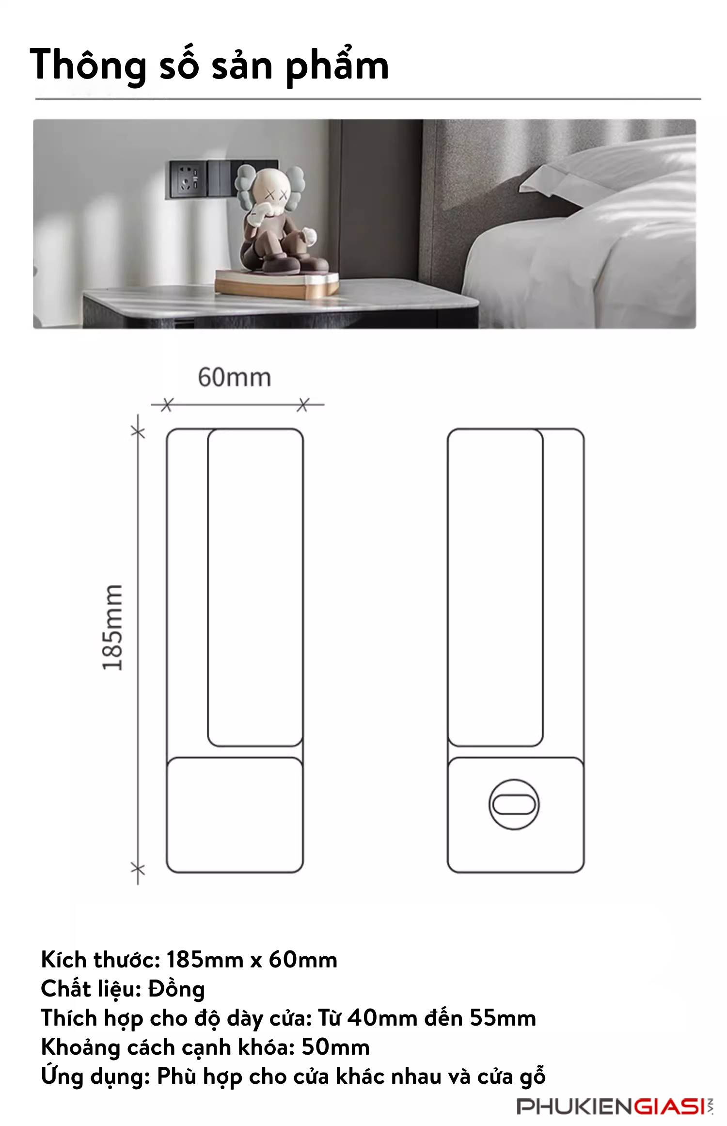 - Thích hợp cho độ dày cửa: Từ 40mm đến 55mm