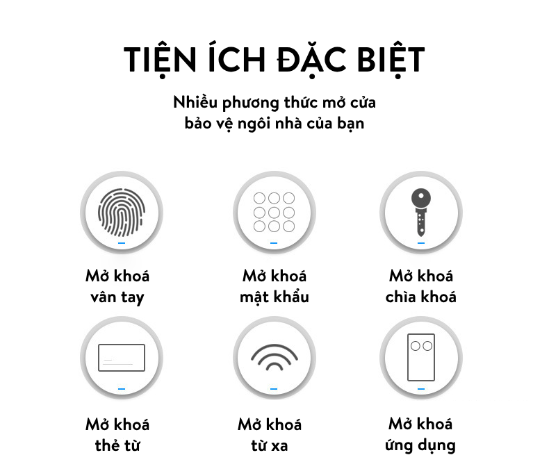 🔹 PHƯƠNG PHÁP MỞ KHOÁ: Vân tay, mật khẩu, quẹt thẻ, chìa khoá (điều khiển từ xa, APP)