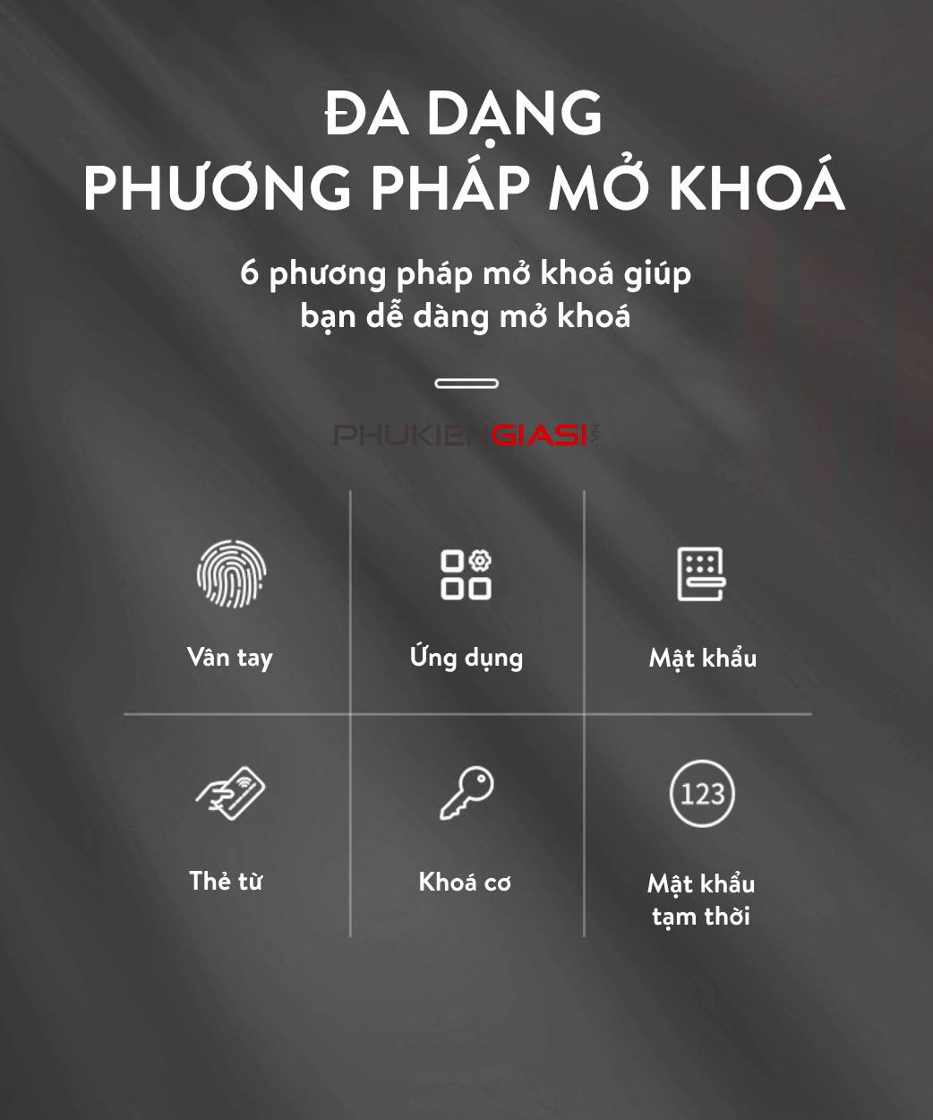 🔹 Sử dụng nhiều phương thức mở khoá bao gồm: Thẻ từ, mật khẩu, chìa khoá cơ, vân tay, mật khẩu tạm thời