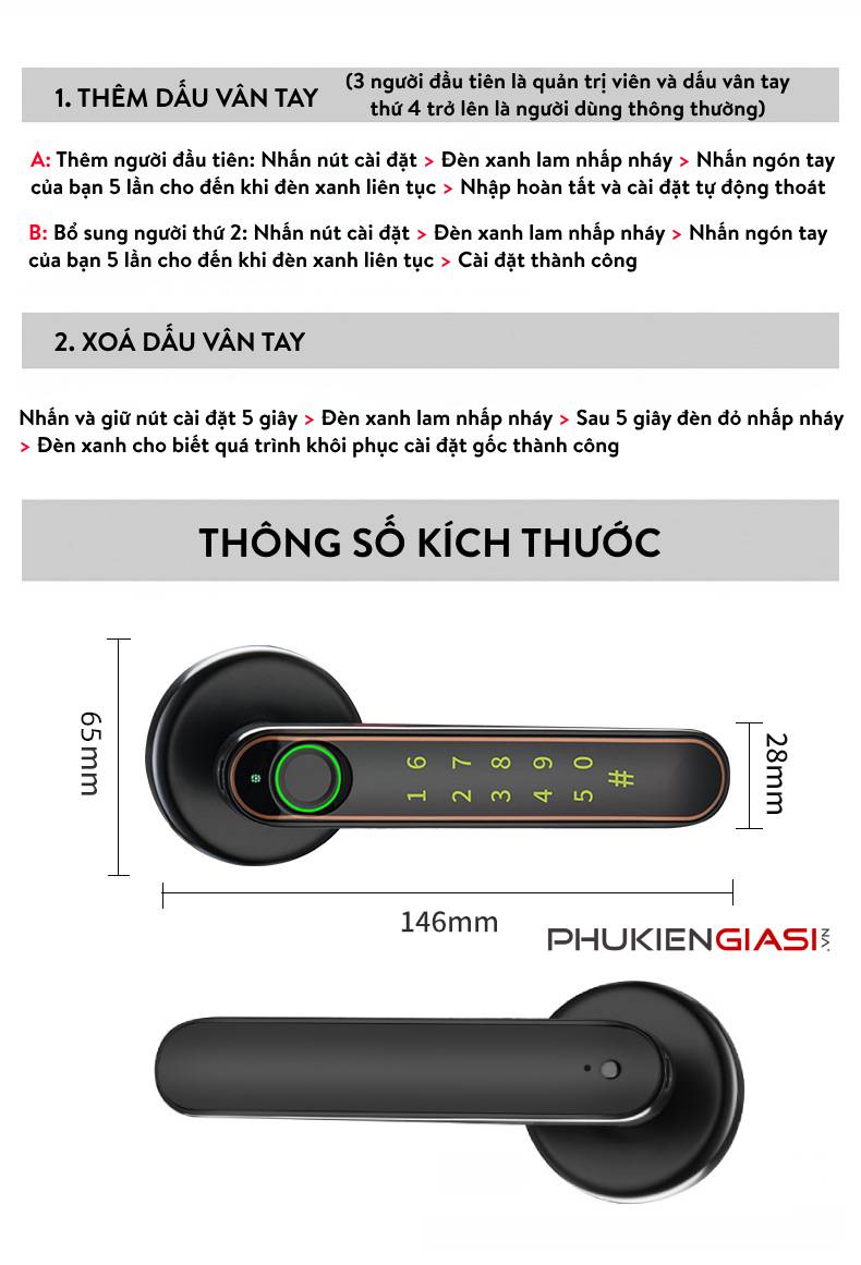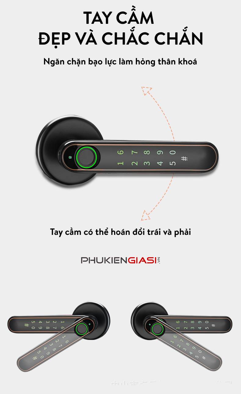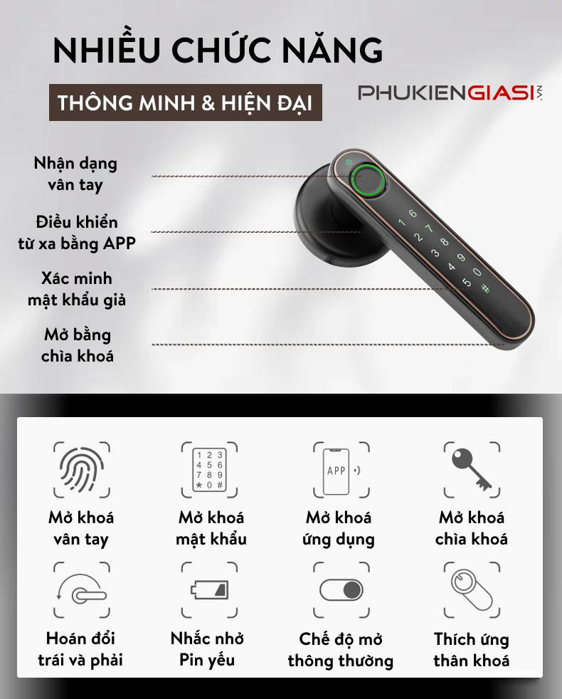 🔹 Khoá cửa có 4 chức năng mở khoá linh hoạt: Vân tay, mật khẩu điện tử, qua APP, chìa khoá..