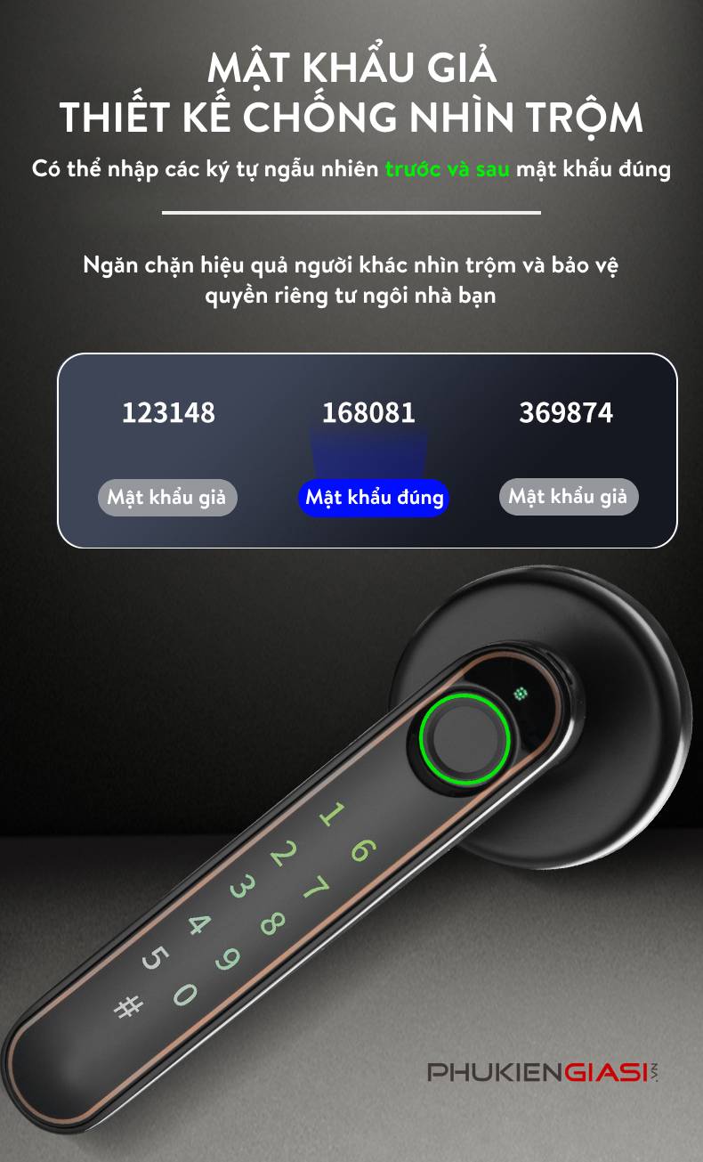 🔹 Khoá cửa có mật khẩu giả. Bạn có thể ấn các dãy số bất kỳ trước và sau mật khẩu đúng để tránh rò rỉ thông tin. Ví dụ mật khẩu đúng là 44566788. Bạn có thể nhập (13247)44566788(320578) miễn sao đúng dãy số mật khẩu liên tục ở giữa thì cửa sẽ mở.