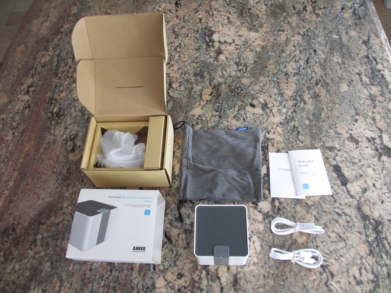 Loa được đặt trong một hộp sản phẩm thân thiện với môi trường, đúng truyền thống những sản phẩm khác của anker. Kèm theo sản phẩm là một túi đựng khá đẹp, sách hướng dẫn sử dụng, cáp sạc usb, cáp âm thanh 3.5mm để kết nối trực tiếp với những thiết bị không có bluetooth. Nhân vật chính là 1 khối hình hộp khá đẹp và chắc chắn, nặng khoảng 285g, kích cỡ khoảng 8x8x7cm. Lưới kim loại không như các loa khác, lưới kim loại của loa anker không dễ dàng uốn cong như bạn ấn vào nó. Ở phía dưới bên phải, bạn có cổng sạc micro usb, cổng kết nối AUX và một nút on/off vật lý. Ở dưới cùng của bảng điều khiển có một khe mic nhỏ để thu nhận cuộc gọi. Ở dưới đáy loa, có một lớp cao su chống trượt loa, một thứ chắc chắn bạn sẽ phải cần khi đang có trong tay một sản phẩm loa mạnh mẽ. Nói chung, cầm trên tay loa Anker, tôi có thể cảm giác được sự tuyệt vời về thiết kế so với những loa khác trên thị trường.
