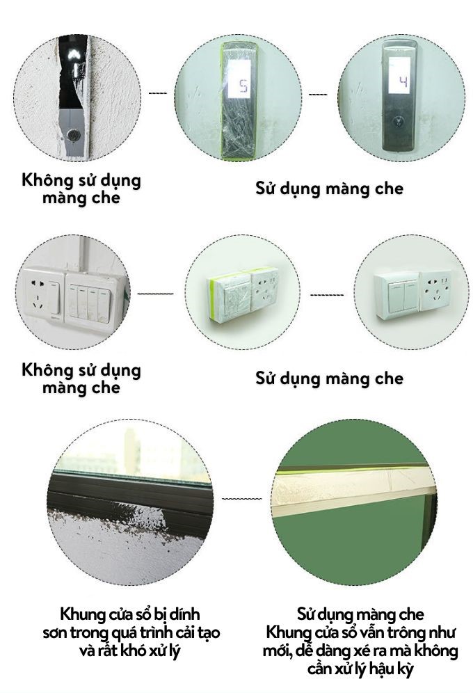 - Bảo vệ bề mặt trong quá trình cải tạo: Khung cửa sổ/cửa đi, cầu thang, lan can, ban công, tay nắm cửa, vòi nước,...