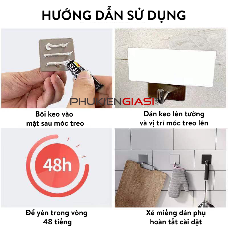 - Móc treo tường thiết kế dính tường bằng keo dán chắc chắn mà không lo hỏng hóc tường bằng khoan vít hay lỗ