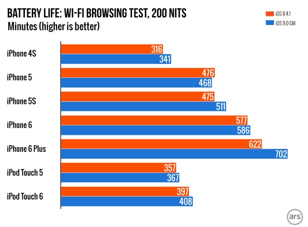 Theo thống kê của trang chuyên về công nghệ ArsTechnica,trước đó, ngay khi nâng cấp từ phiên bản iOS 8.4.1 lên phiên bản iOS 9.0 thì thời lượng pin của smartphone này cũng đã được cải thiện rất đáng kể. Đặc biệt, với bản cập nhật mới nhất iOS 9.2 thì người dùng hoàn toàn có thể yên tâm về thời lượng pin nếu sử dụng Iphone 5s trong cả ngày dài.