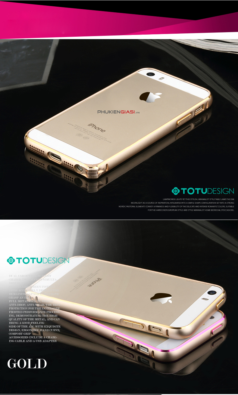 Ốp viền iPhone 5/5S Totu giả iPhone 6 với chất liệu Nhôm titan siêu nhẹ và mỏng .Viền nhôm siêu mỏng, siêu nhẹ chỉ 0.7mm mỏng.Thiết kế với các đường viền, góc cạnh xung quanh đơn giản mà tinh tế. Thiết kế mới có kẻ chỉ vàng xuyên suốt viền, cả mặt trước lẫn mặt sau. Có khoét lỗ âm âm thanh,..., có nút tăng âm lượng, nút mở nguồn.