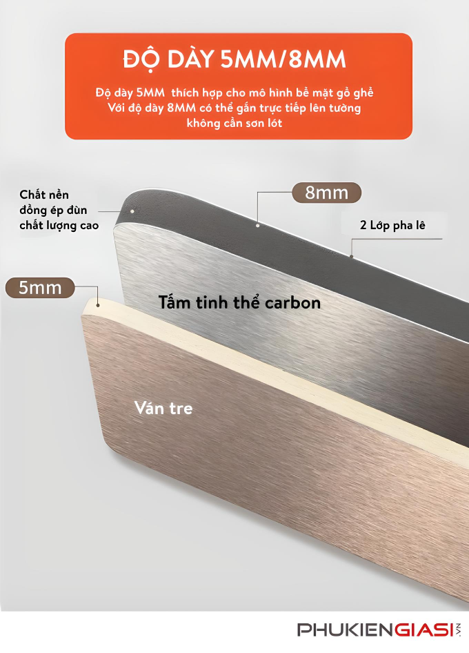 - Kích thước: 1.2 x 2.44, 2.6, 2.8, 3, 3.2, 3.6 mét