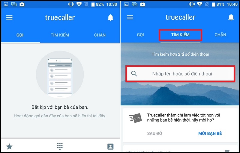Tuy nhiên, diao diện của ứng dụngTruecaller lại khá đơn giản chỉ gồm có ba thẻ chính là Gọi, chặn và Tìm kiếm thông tin. Nếu muốn tra cứu thông tin về một người bất kỳ, bạn nên chuyển sang thẻ Tìm kiếm sau đó nhập số điện thoại cần tìm nhờ ứng dụng bạn có thể tìm ra chủ nhân của số điện thoại đó dễ dàng.