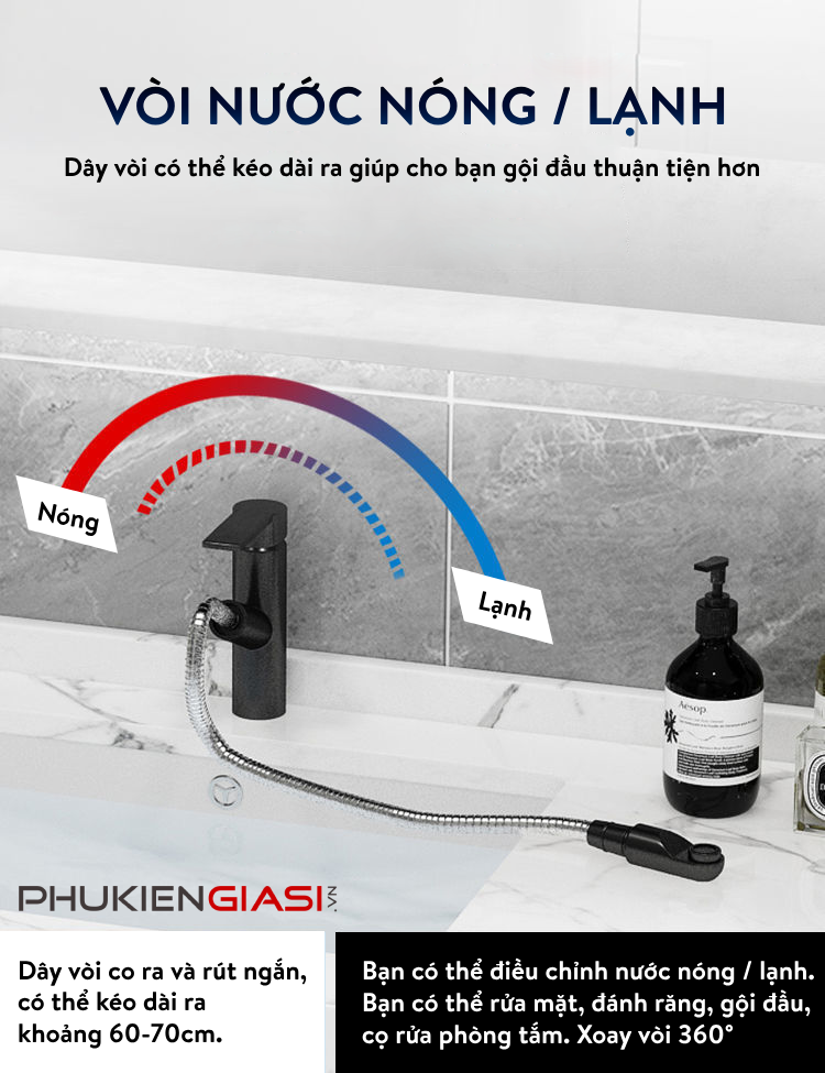 - Vòi nước ở bồn rửa có thể kéo ra và rút gọn vào. Một tiện ích giúp bạn có thể gội rửa, vệ sinh nhà tắm sạch sẽ.