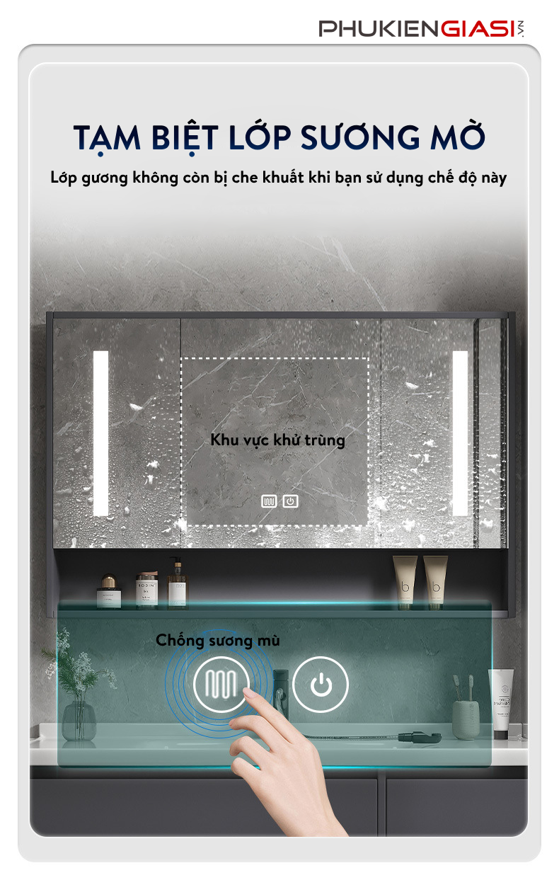 - Tủ gương thông minh có chế độ khử trùng, loại bỏ lớp sương mờ khi bạn tắm nước nóng.