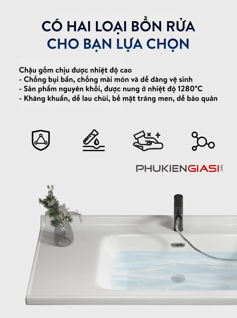 - Loại bồn rửa: Chậu gốm tích hợp mặt bàn đá tráng men