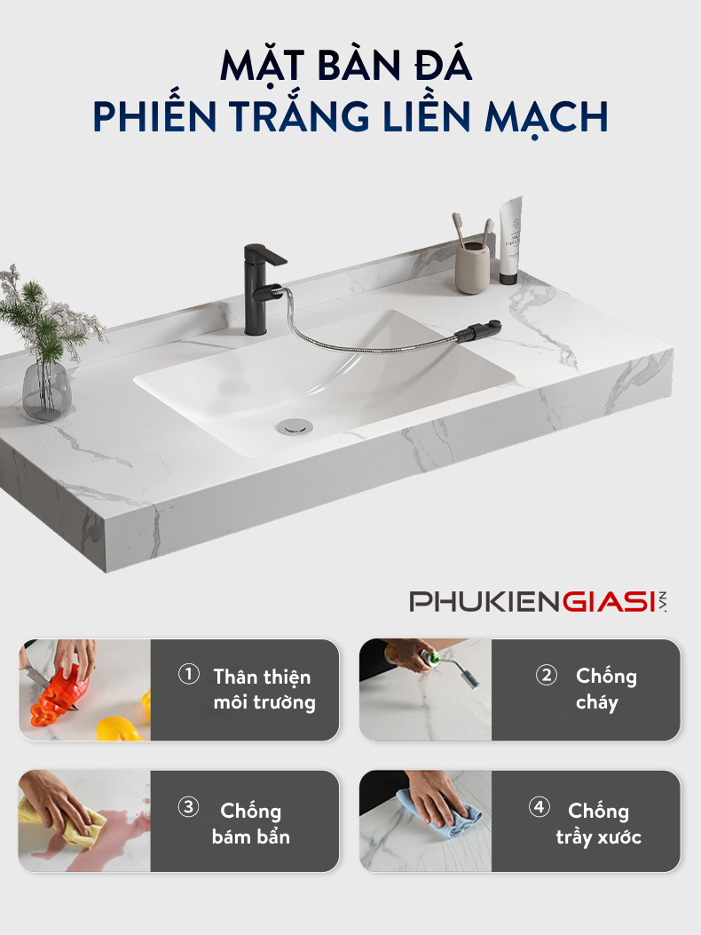 - Mặt bàn đá chống cháy, chống trầy xước, hạn chế góc chết bám bụi bẩn. Thiết kế góc cạnh thông minh, không gây bắn nước ra ngoài.