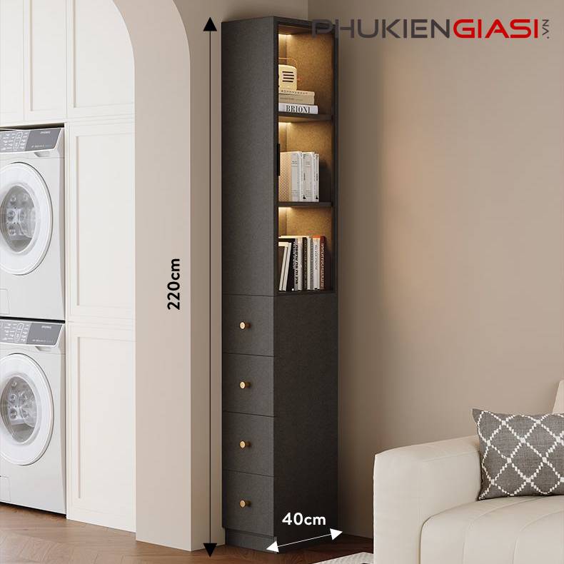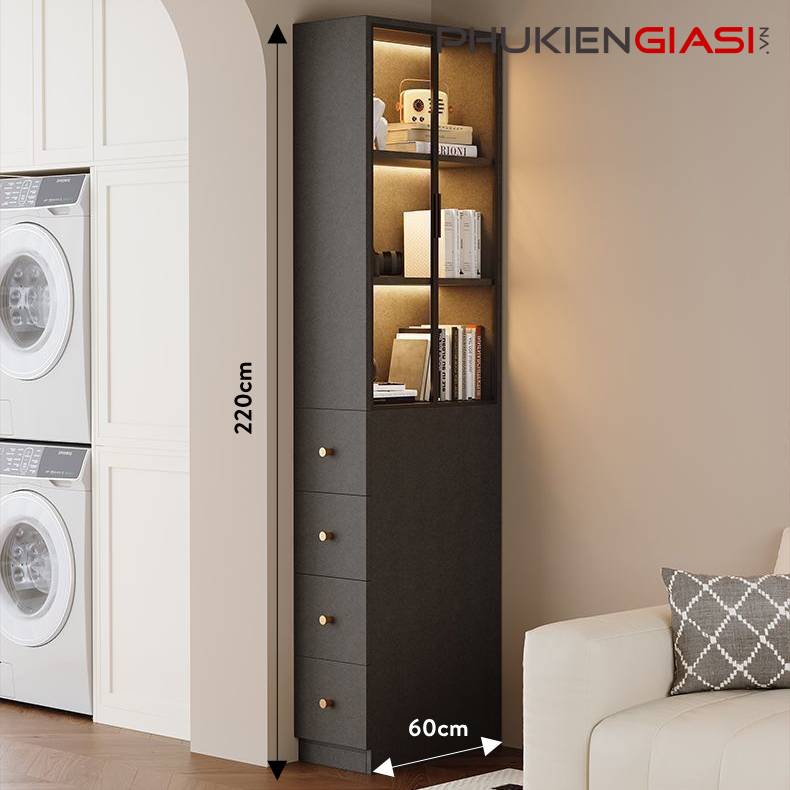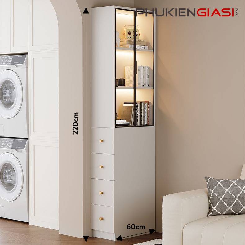 Việc tách biệt phần ngăn kéo sang bên giúp mặt trước tủ (khu vực cánh nhôm kính) luôn sạch sẽ, thông thoáng và đẹp mắt. Thuận tiện cho việc trưng bày các vật phẩm thẩm mỹ mà không bị rối mắt hoặc lộn xộn bởi phần lưu trữ kín.
