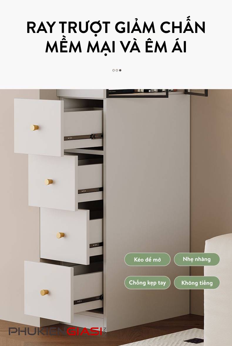 Phần tủ trên sử dụng bản lề giảm chấn cao cấp, giúp đóng mở cánh tủ êm ái, không gây tiếng ồn, tăng độ bền cho cánh nhôm kính. Ngăn kéo bên dưới được trang bị thanh ray trượt giảm chấn, trượt nhẹ nhàng và chắc chắn ngay cả khi chứa đồ nặng.