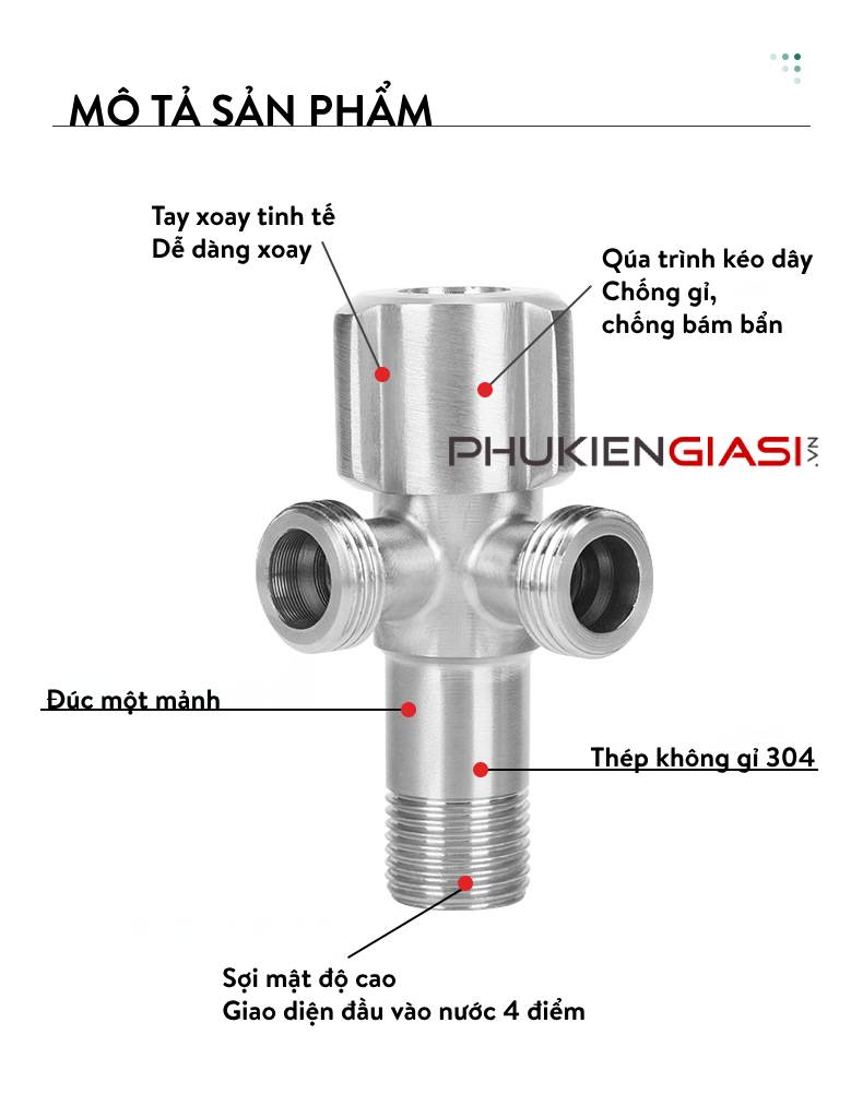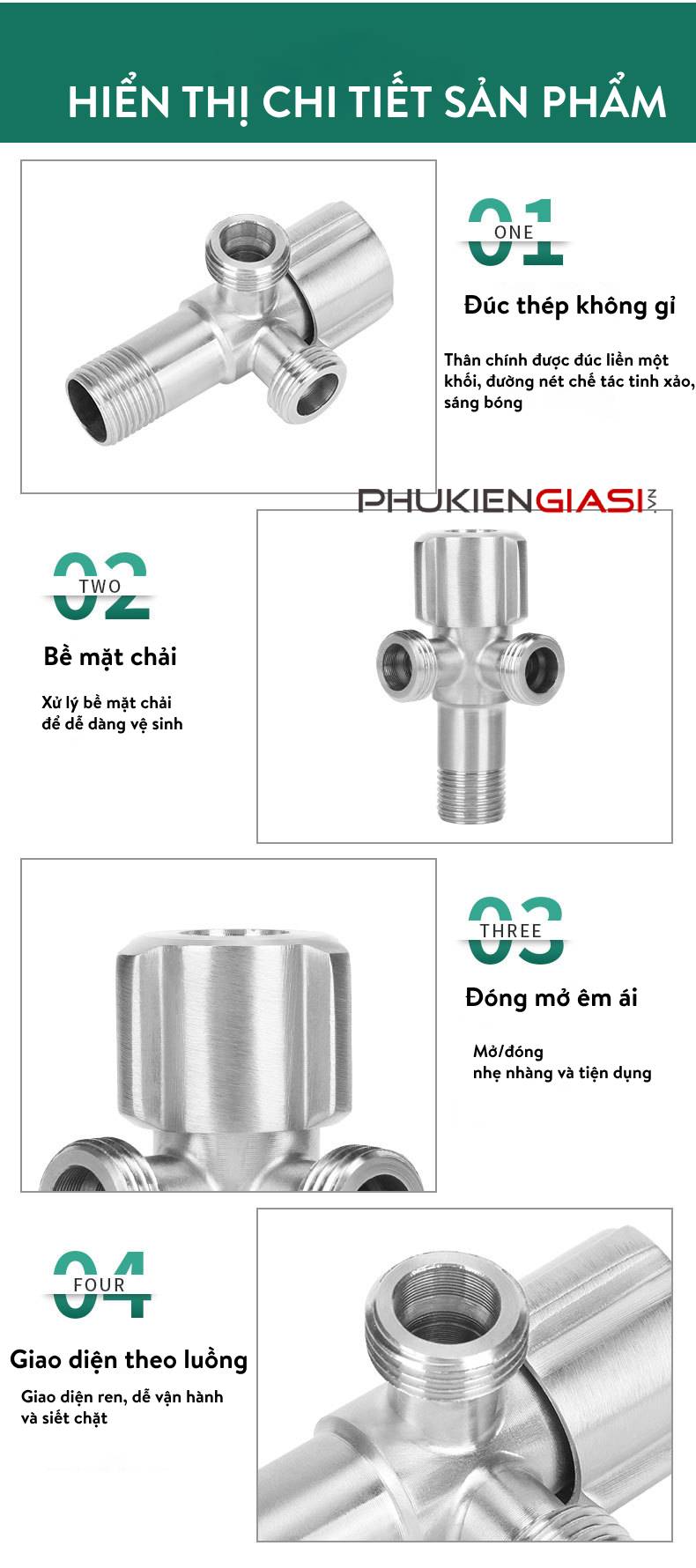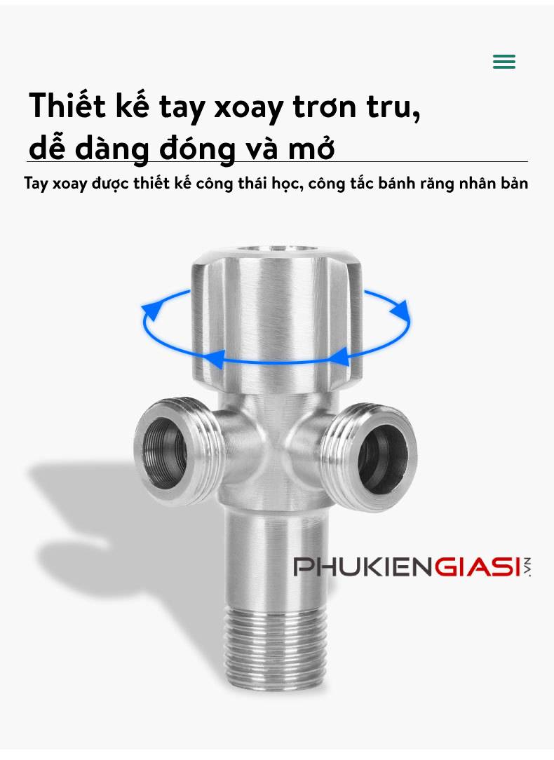 Van chia nước này được thiết kế với 3 đầu ra nước, cho phép người dùng dễ dàng điều chỉnh và phân phối nước tới nhiều vị trí khác nhau. Điều này rất hữu ích trong các hệ thống tưới tiêu, cấp nước cho nhiều khu vực trong một tòa nhà hoặc nhà máy sản xuất. Đặc biệt, thiết kế góc 90 độ giúp tối ưu hóa không gian lắp đặt và đảm bảo hiệu quả vận hành của hệ thống.