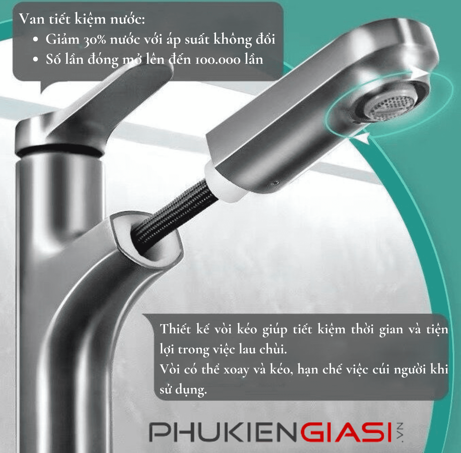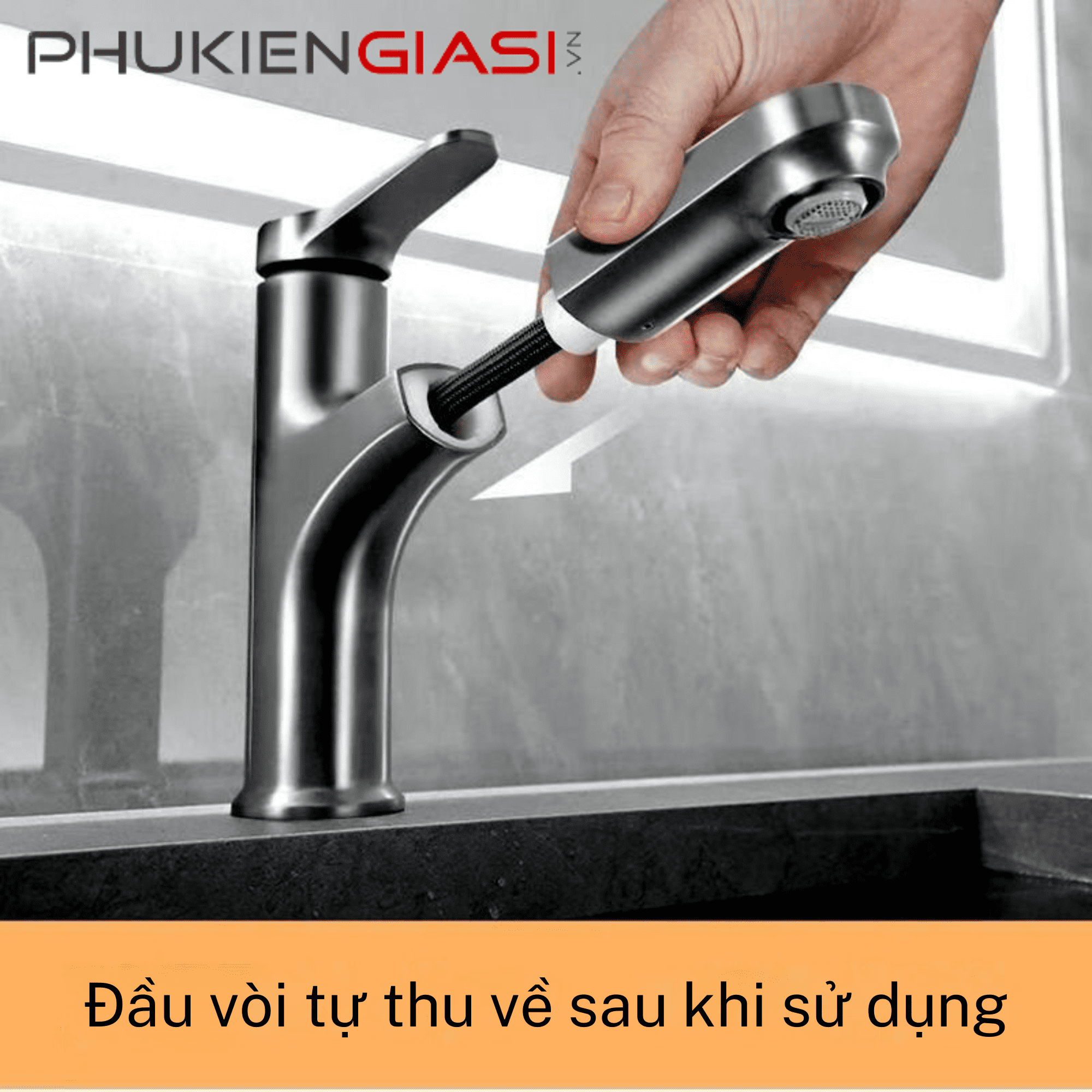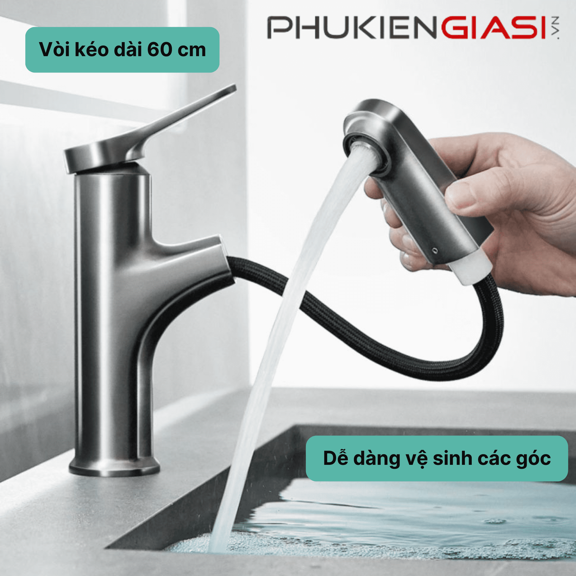 - Đầu vòi có thể kéo dài 60 cm, xoay 3600 giúp tăng phạm vi vệ sinh của vòi, dễ dàng vệ sinh mọi ngóc ngách. Sau khi sử dụng, đầu vòi tự động thu về theo cơ chế bóng trọng lực.