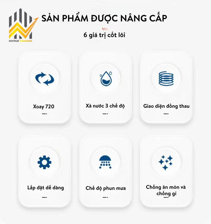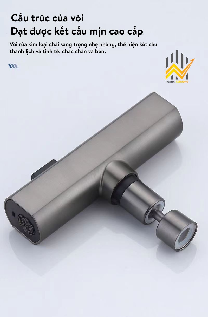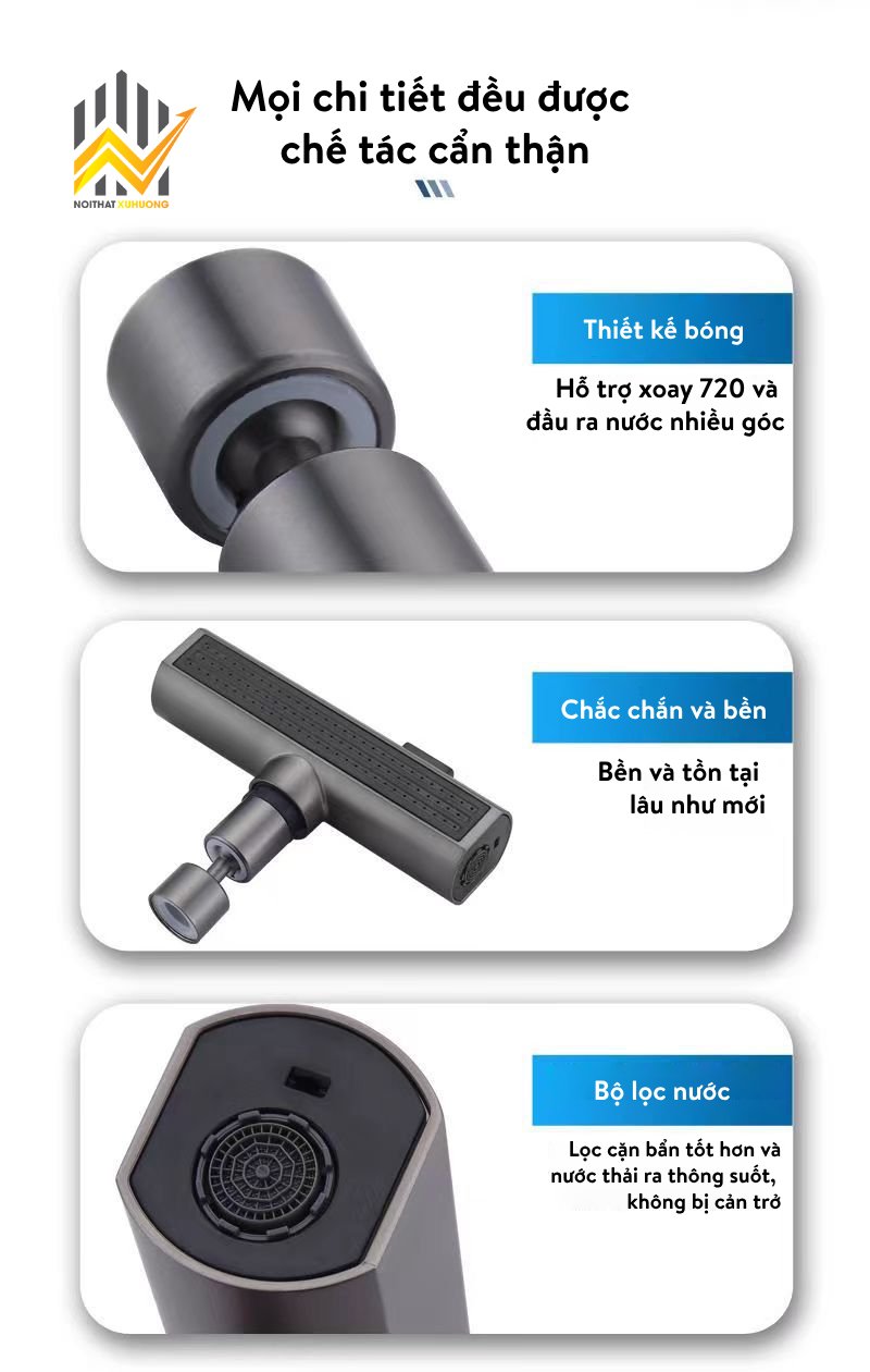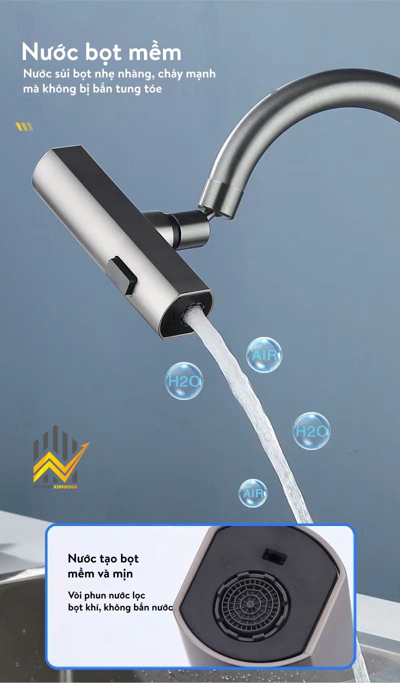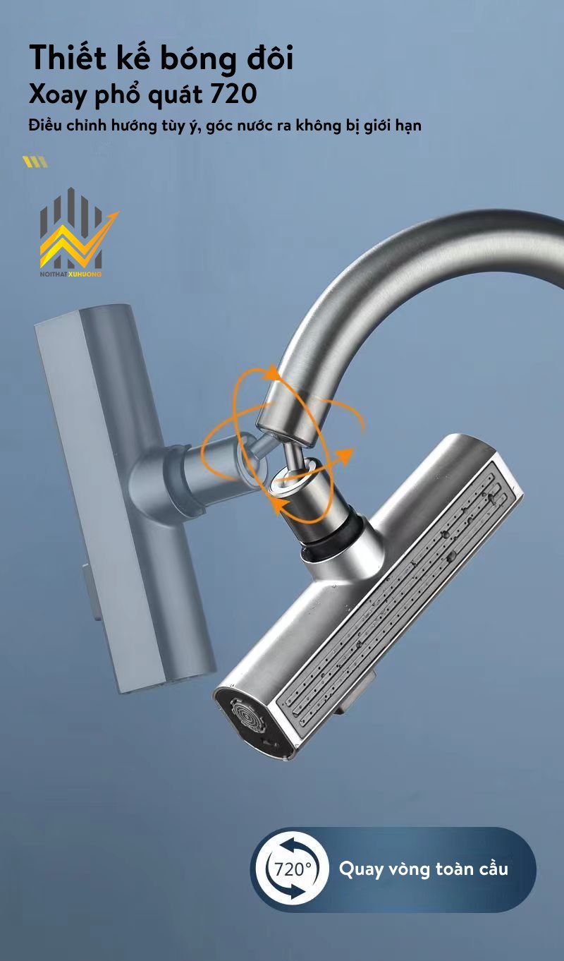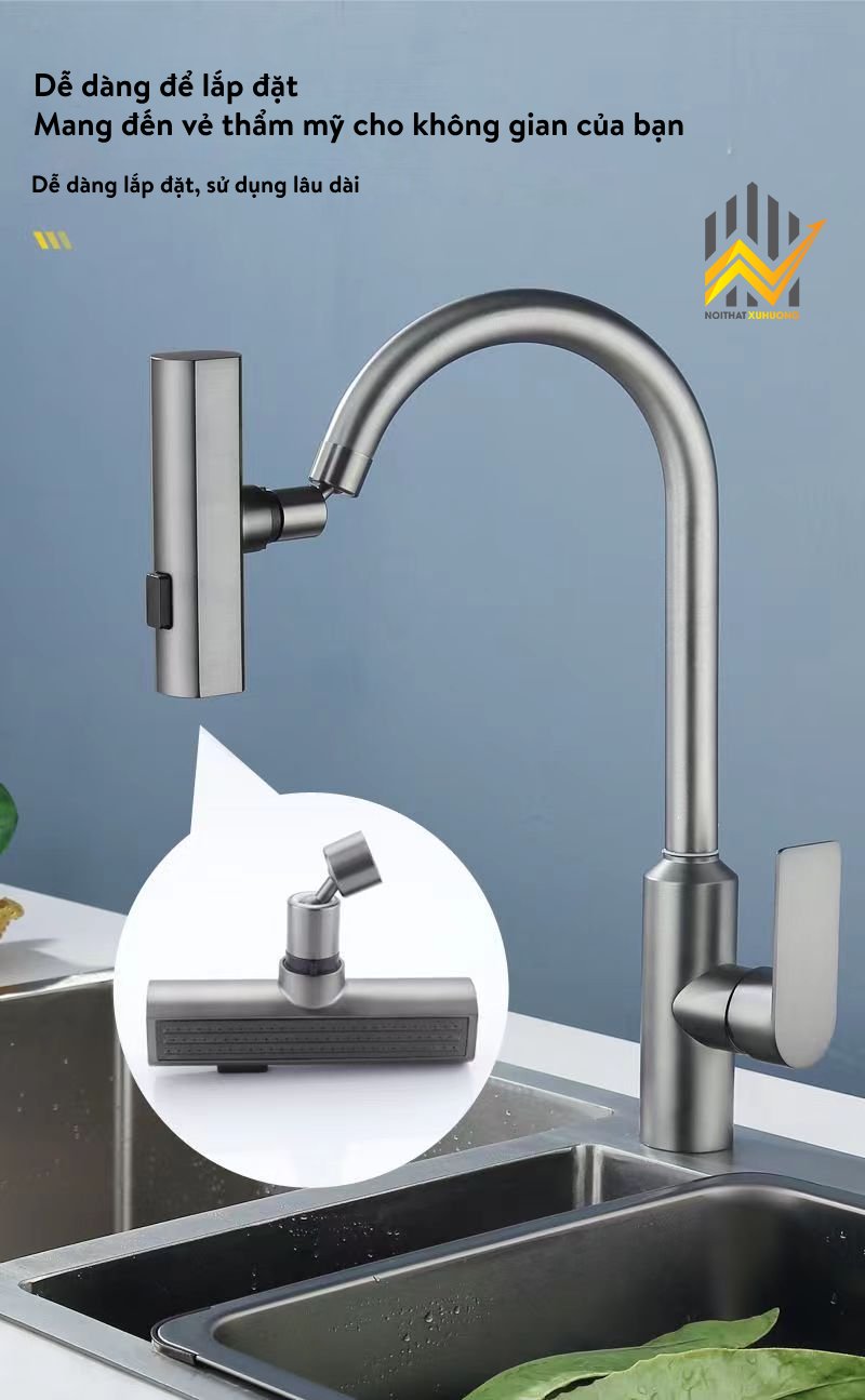 Vòi nước được thiết kế với khả năng xoay 720 độ, giúp dễ dàng điều chỉnh hướng nước theo nhu cầu sử dụng. Thiết kế này cũng giúp tiết kiệm không gian và tạo cảm giác thoải mái khi sử dụng. Ngoài ra, sản phẩm còn tích hợp bộ lọc nước tiên tiến, giúp loại bỏ tạp chất và cặn bẩn, mang lại nguồn nước sạch và an toàn.