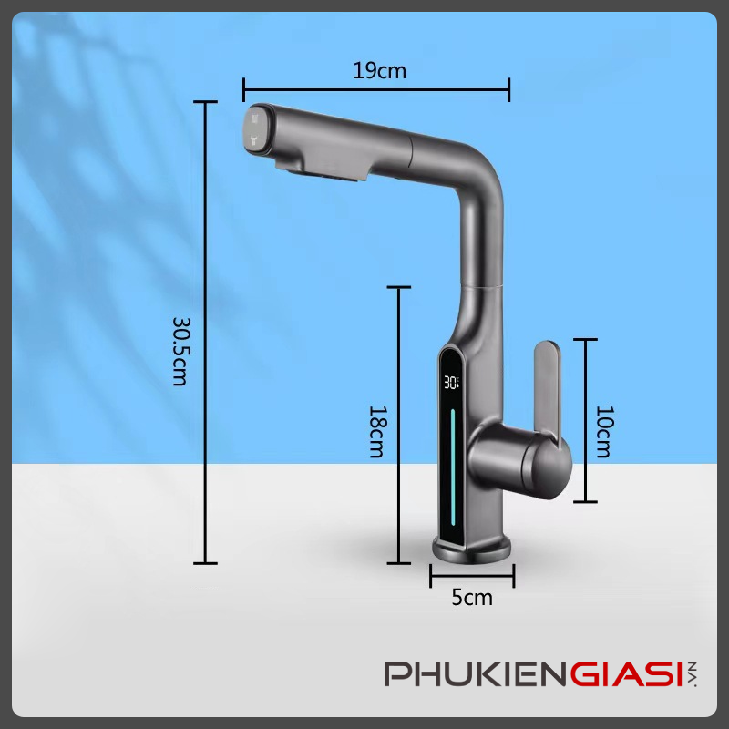 - Kích thước: 30.5cm x 19cm (Thân vòi: 18cm, đường kính: 5cm)