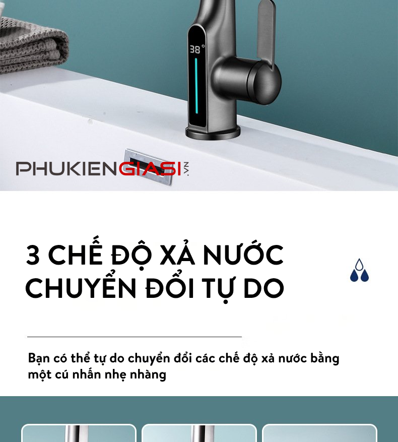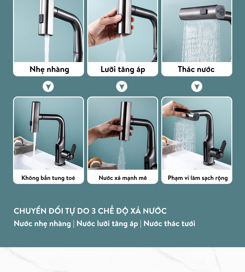 - Có 3 chế độ xả nước: Nước thường | Lưỡi tăng áp | Thác tưới